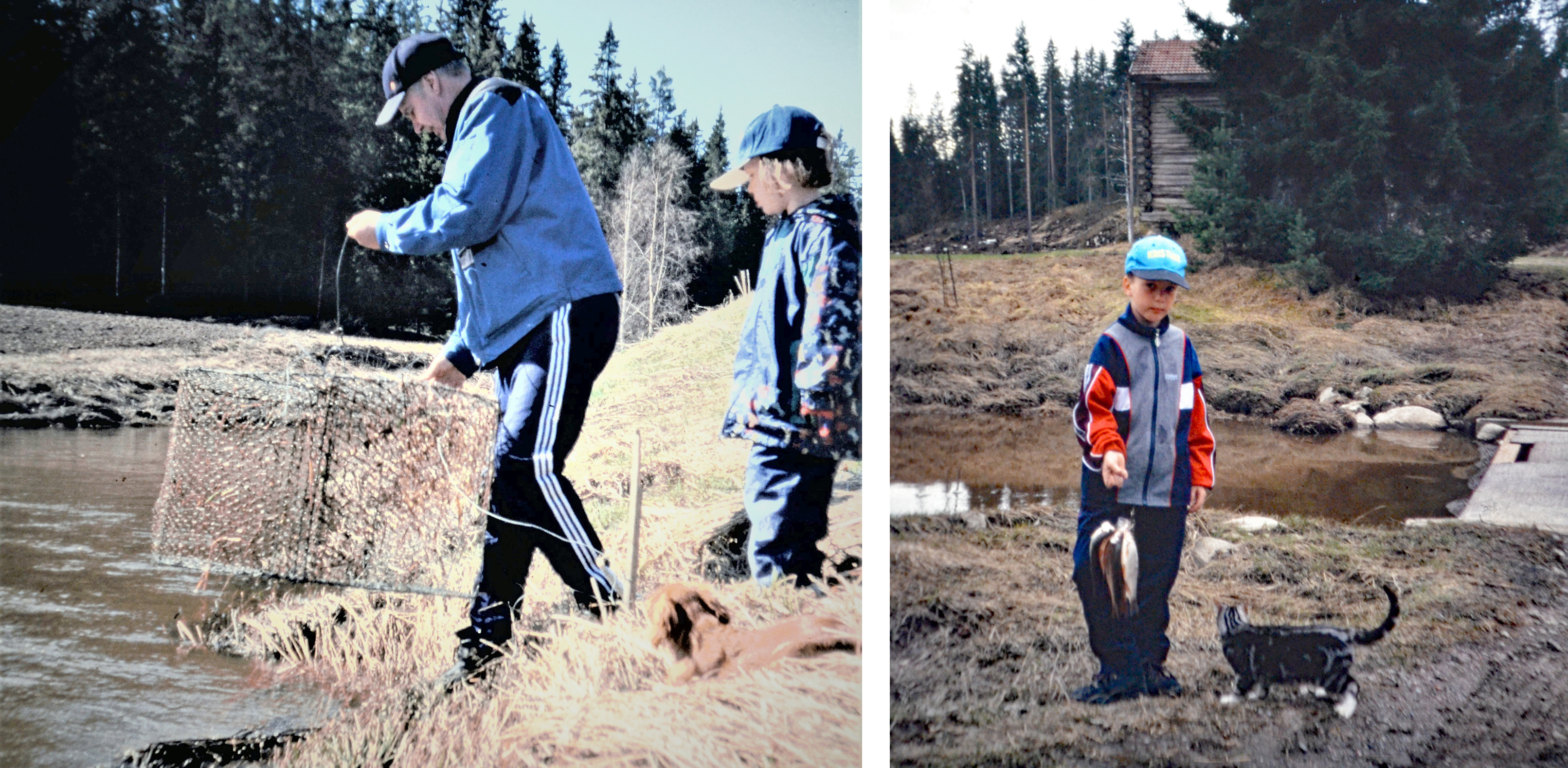 Anniina pappan kanssa kalassa. Oik. Kristian kalasaaliin ja kissan kanssa.