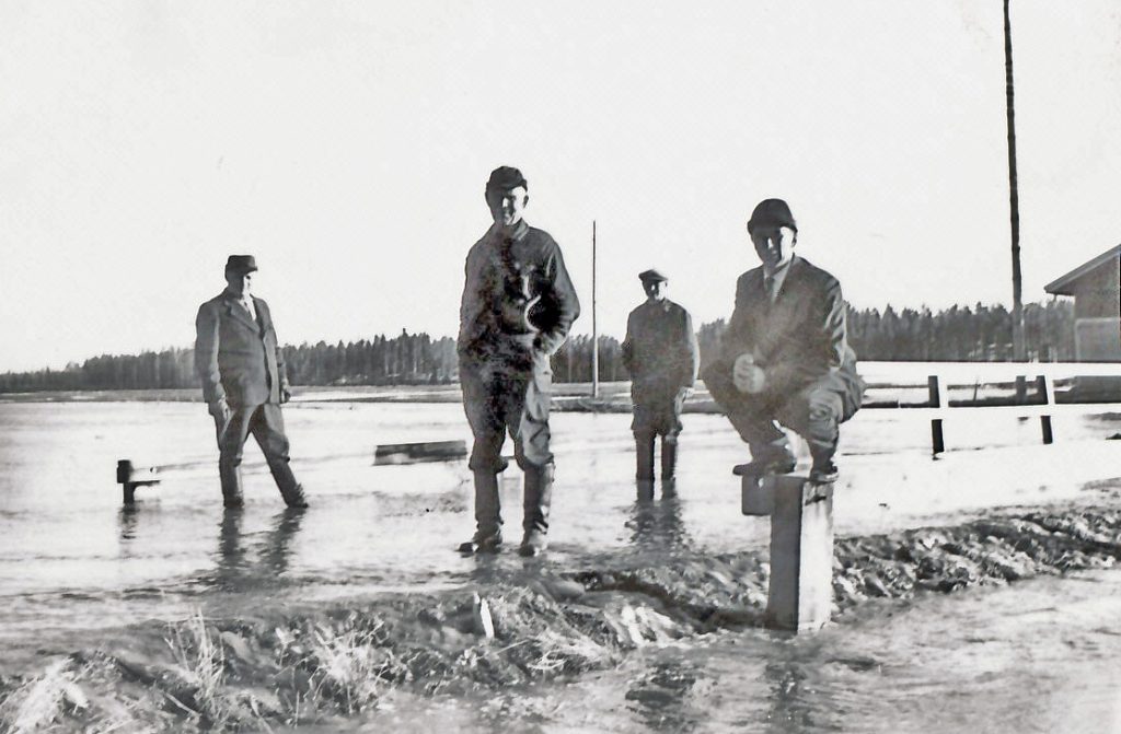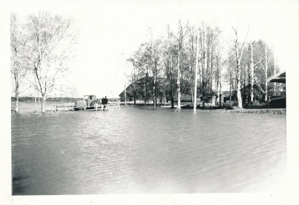 Keskellä: Rekolan oma silta veden alla, traktori ajettu sillalle painoksi, Takana näkyy Rekolan navetta.