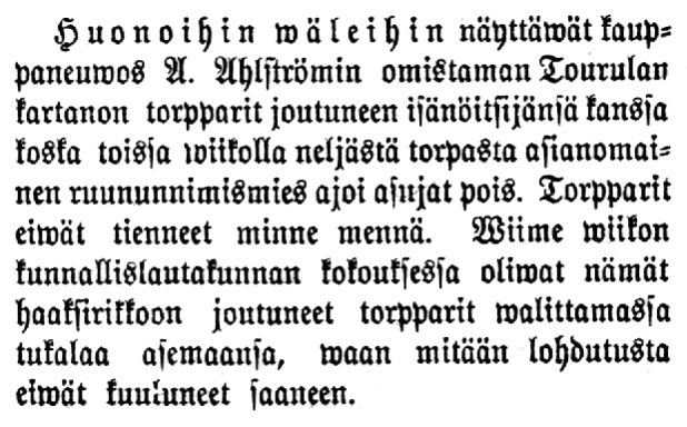 Tämä melko vapaa metsien käyttö muuttui Tourulassa, kun A. Ahlström tuli omistajaksi 1800-luvun lopulla. A. Ahlström omisti puunjalostusteollisuutta ja oli ostanut koko kartanon sen suurten metsävarojen vuoksi. Metsien käyttöä alettiin alustalaisilta rajoittaa ja valvoa tarkasti, kuten aiemmin sivulla 9. olleista lehtijutuista ilmenee.
