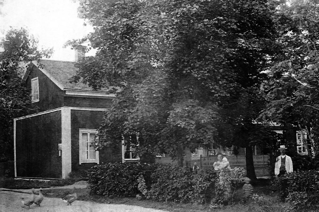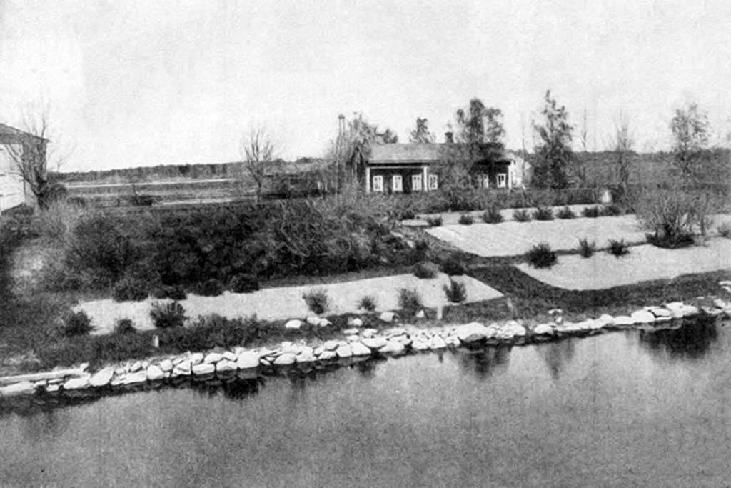 Kartanon meijeri sijaitsi sillan pielessä navetalle menevän tien varressa, nykyisellä Haapaniementiellä, takana näkyy vaalea navetta.