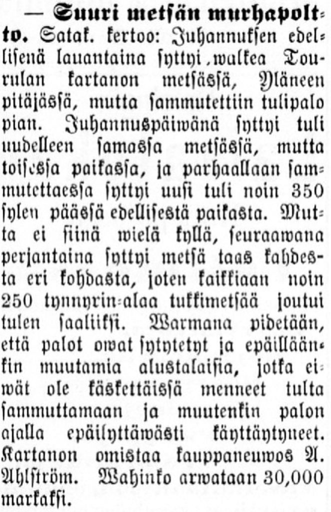 Lehtikirjoitukset v. 1891 torpparien häädöstä, joka johtui torpparien omavaltaisesta metsän myynnistä ja samana kesänä olleista tahallaan sytytetyistä metsäpaloista. Nämä asiat yhdistettiin toisiinsa, mutta ketään ei tuomittu.