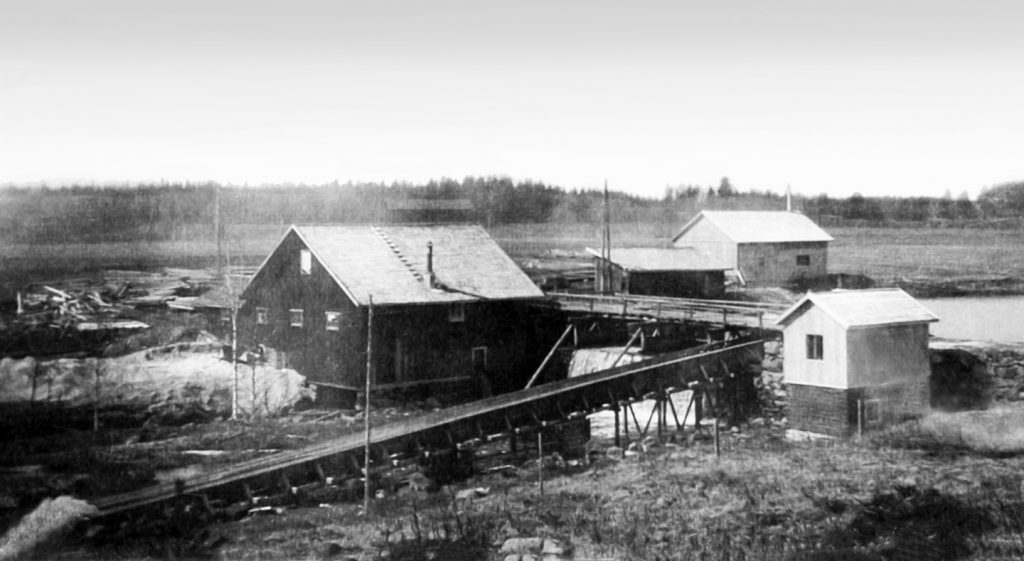 Padon yli johtaa tukkiruuhi ja oikealla myllärin sauna. Kuva 1940-luvulta. Mylly paloi 1900-luvun alussa ja uusi valmistui v. 1915. Mylly ja saha myytiin v. 1945 kartanon myynnin yhteydessä, entiselle mylläri-seppä Armas P. Oleniukselle.