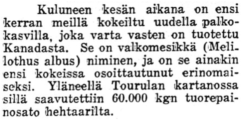 Myös erikoisia rehukasveja kokeiltiin, kuten 1930-luvulla valkomesikkää.