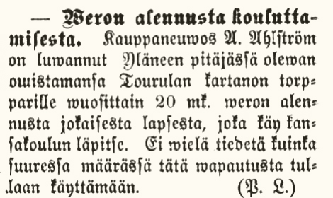 Antti Ahlströmin aikana Tourulaan perustettiin v. 1895 koulu alustalaisten lapsille. Torppareita houkuteltiin laittamaan lapsiaan kouluun antamalla veron (vuokran) alennusta 20 mk vuodessa.