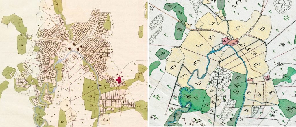 Oikealla: Isojaon jälkeen pellot oli jaettu isompiin lohkoihin, kartta v. 1783.