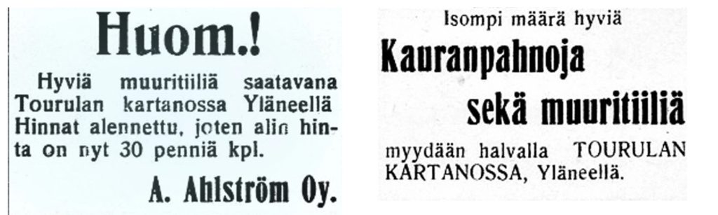Kartanolla oli oma tiilitehdas, alkuun omiin tarpeisiin, mutta myöhemmin tiiliä myytiin muillekin. Makkarkosken ja Pöytyän meijerien rakentamiseen käytettiin Tourulan tiiliä ja Yläneen seurakuntatalon rakentamiseen Ahlström Oy lahjoitti 3000 tiiltä.