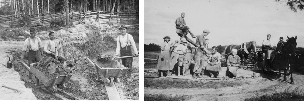 Saven nostoa ja tiilimassan tekoa hevoskierrolla,1920–30-luvulla.