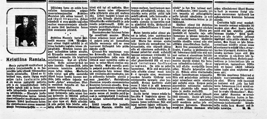 Kristiina-mummo on sielunvoimiltaan vielä aivan terve, osoittamatta vähääkään ns. vanhuuden höperyyttä. Kristiina Rantalasta voidaan sanoa, että hän on vilpitön ja rehellinen, sekä syvästi uskonnollinen. Kaikista puutteesta ja sairaudestaan huolimatta hän on tyytyväinen siksikin, että on saanut nähdä lastenlasten lapset, aina neljänteen polveen asti.