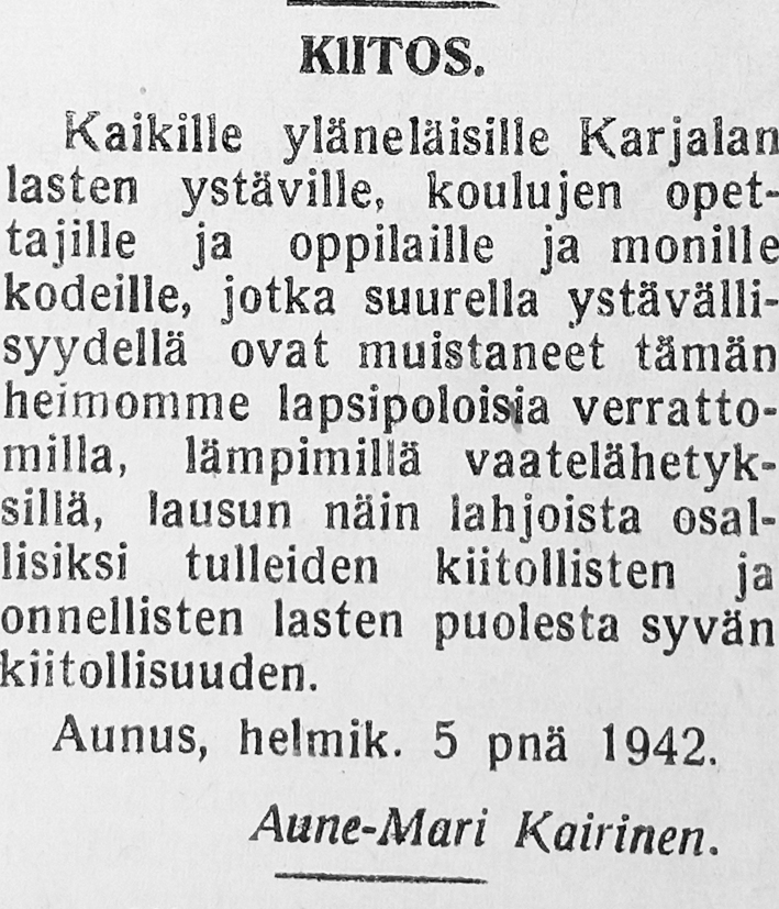 Yläneläinen Opettaja Aune Kairinen esitti Yläneen koulujen opettajille ja koululaisille Kunnallisessa viikkolehdessä tammikuussa 1942 vetoomuksen vaate- ja kenkälahjoituksista Aunukselaisen koulun karjalaisille oppilailleen. Yläneläisten opettajien johdolla järjestettiin kouluilla suuri tuottoisa vaatekeräys Aunukseen.